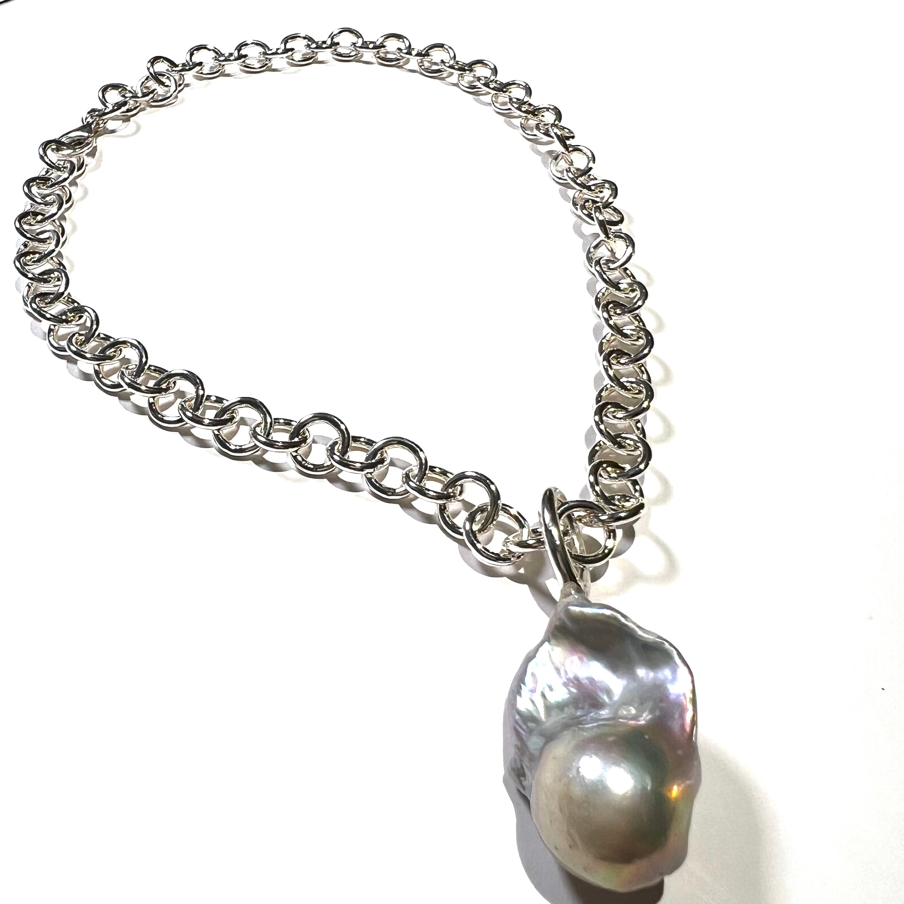 Eine sehr coole Ankerkette mit einer dicken Barock Perle als Anhänger!.. mehr brauch man nicht.. denn diese Statementkette passt zur Jeans wie zum Kleid .. schick oder lässig!!… einfach Immer!!!   Material: Barockperlen , Silber...