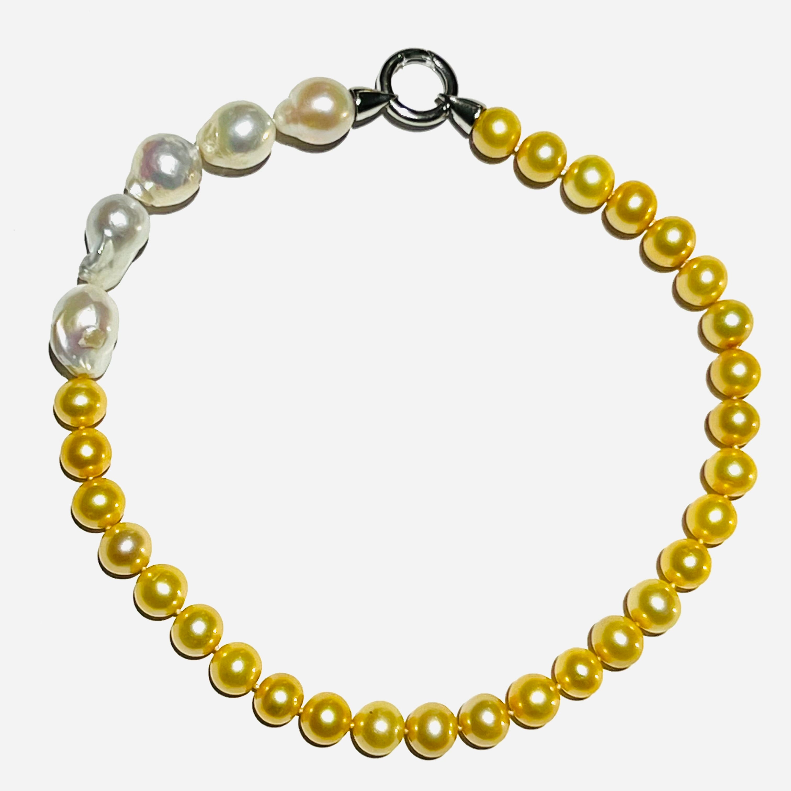 Perfekte gelbe Süßwasserzuchtperlen reihen sich wie kleine Sonnen an der Kette.. das goldene Gelb macht gute Laune und funkelt wie im Sonnenlicht.. kombiniert mit weißen Barockperlen eine raffinierte Symbiose..   Material: Süswasserzuchtperlen, Barockperlen , Silber...